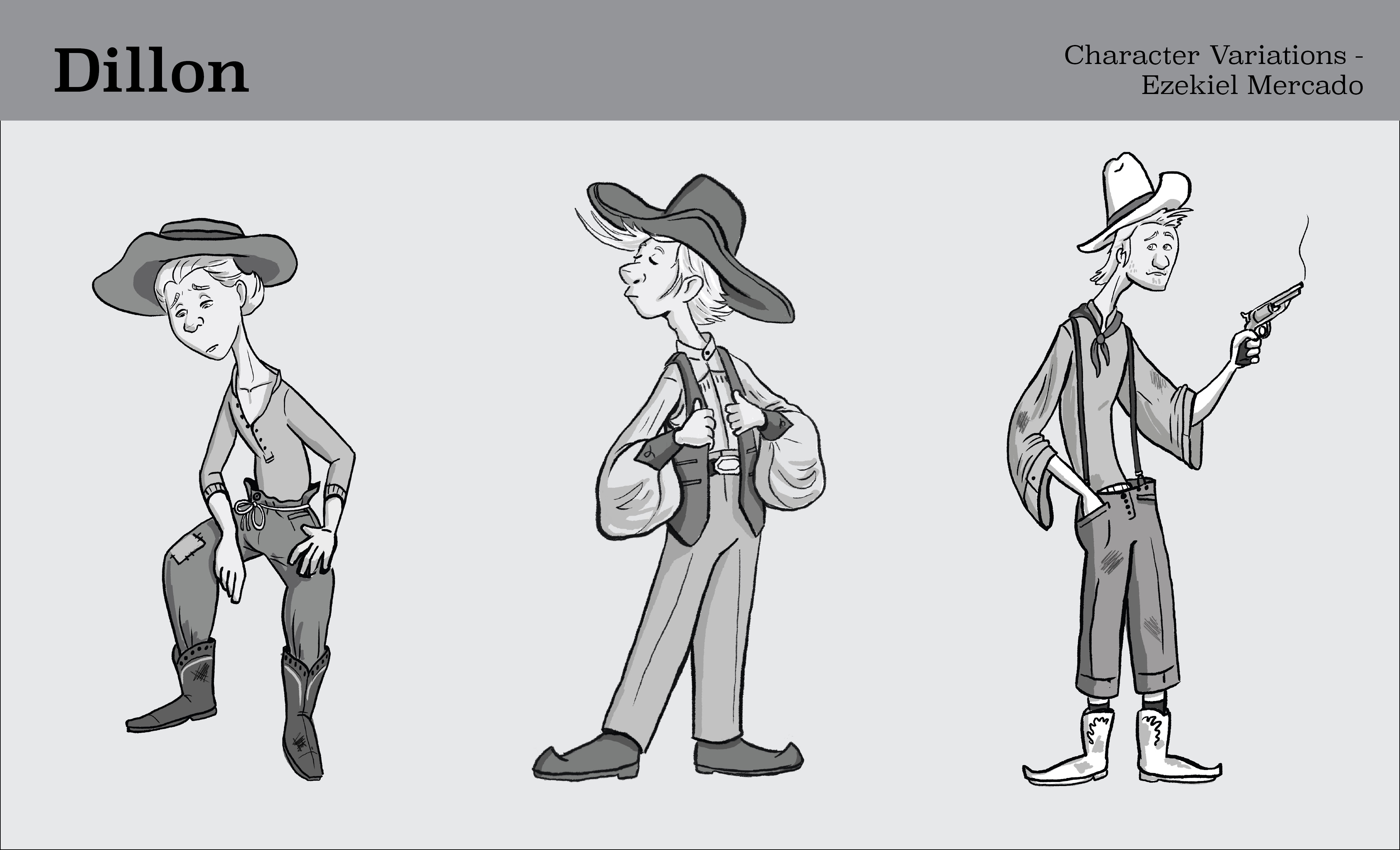 He is tall and thin, with blond hair and dirty, ragged cowboy clothes. His clothes and hat all should look a mite too big for him, since they are hand-me-downs from his out-of-luck father. He has a natural ability to be a gunslinger, but he never practices. Few people know that he could be the best there ever was, if he had any motivation in him. Even with his lack of gumption, Dillon is very likable, as he has a heart of gold, cares for the town and all the people in it, and treats his best friend, his horse, like a brother. If he could ever muster some motivation, he could win Polly's heart and become mayor of the town he loves.